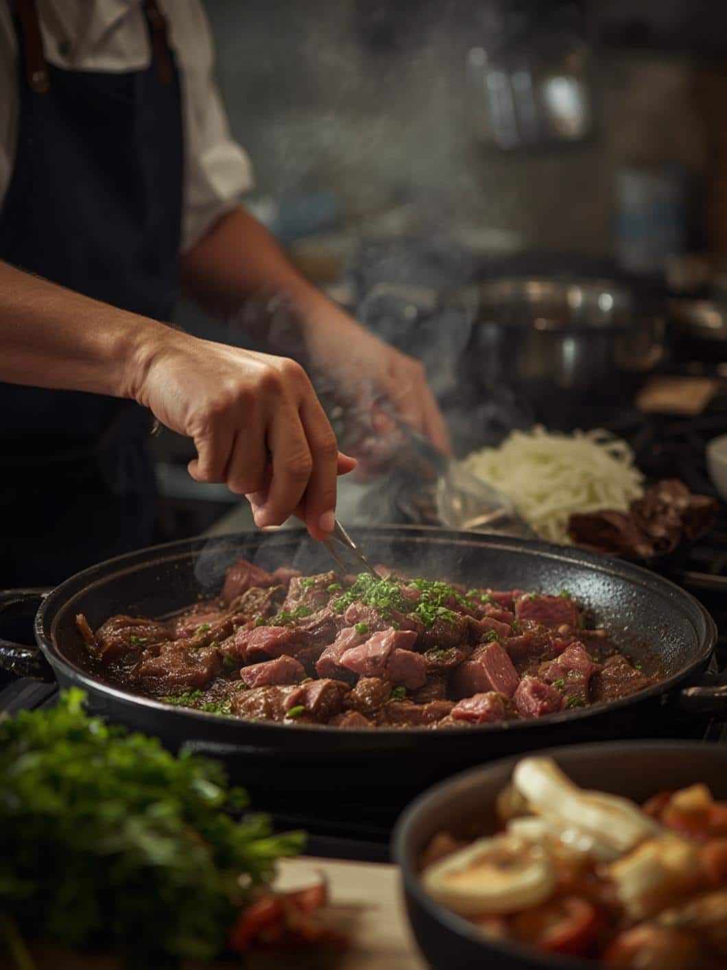 - Add sliced beef to the marinade and let sit for 5–10 minutes.