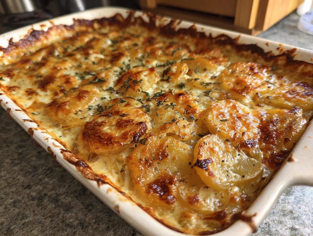 Okay, so to make these amazing scalloped potatoes, you’ll need a 9×13 inch baking dish, a saucepan, a whisk, and a good knife (or a mandoline if you’re fancy!). Easy peasy!